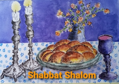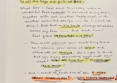 Our challah project connects children with survivors of the Holocaust. The children draw pictures every week, which are turned into place-mats. These are delivered by our wonderful team of volunteers along with a freshly baked challah from Sharon’s bakery. Our volunteers stop outside for a chat, bringing warmth and kindness along with a challah to brighten up Shabbat.